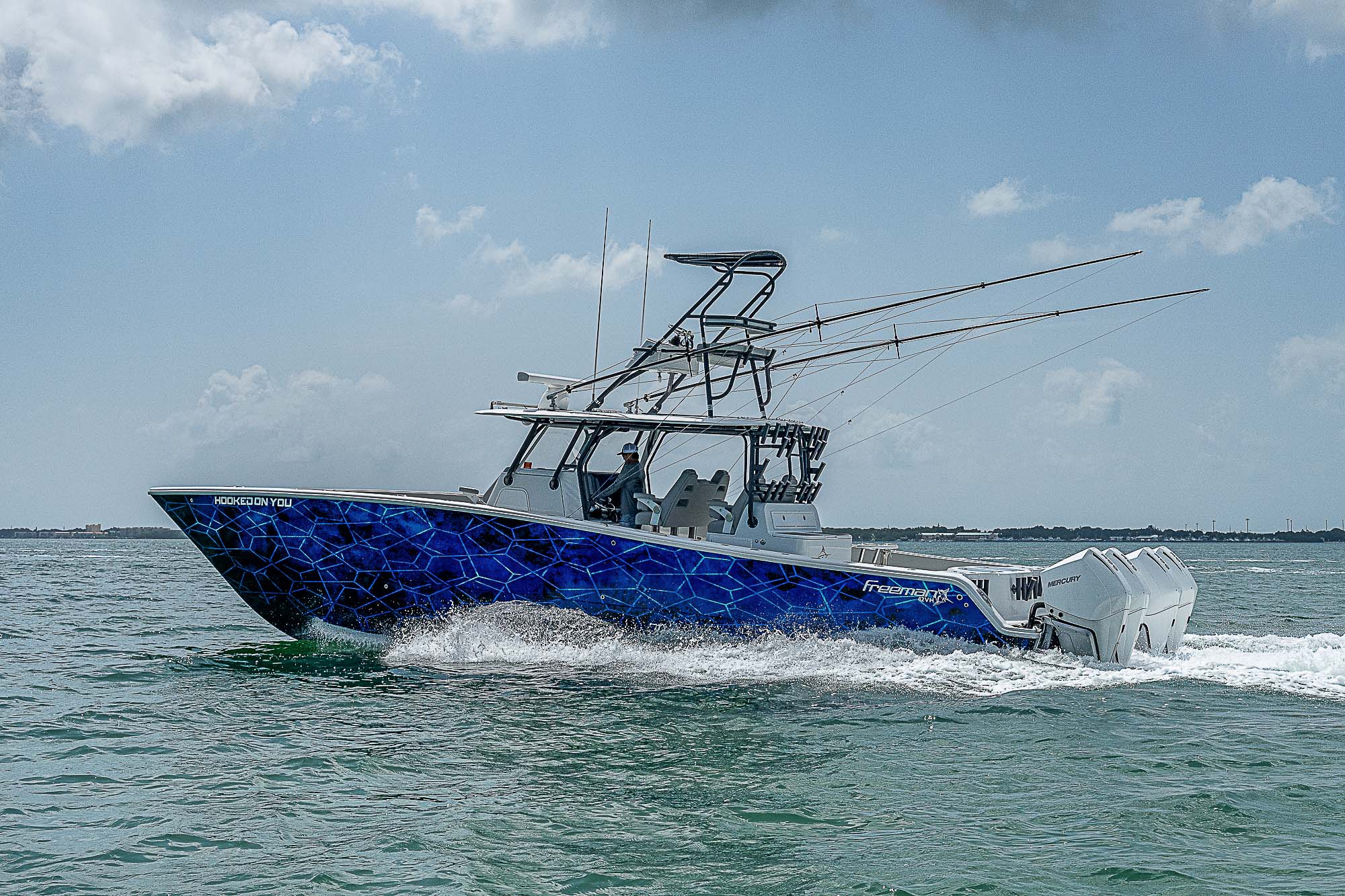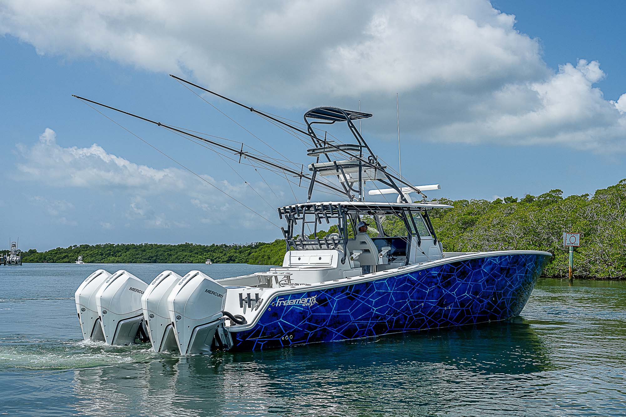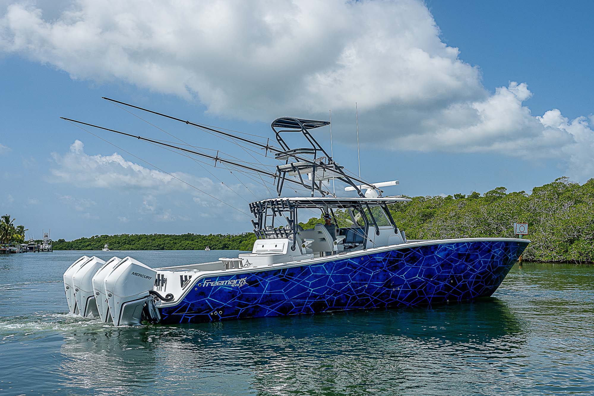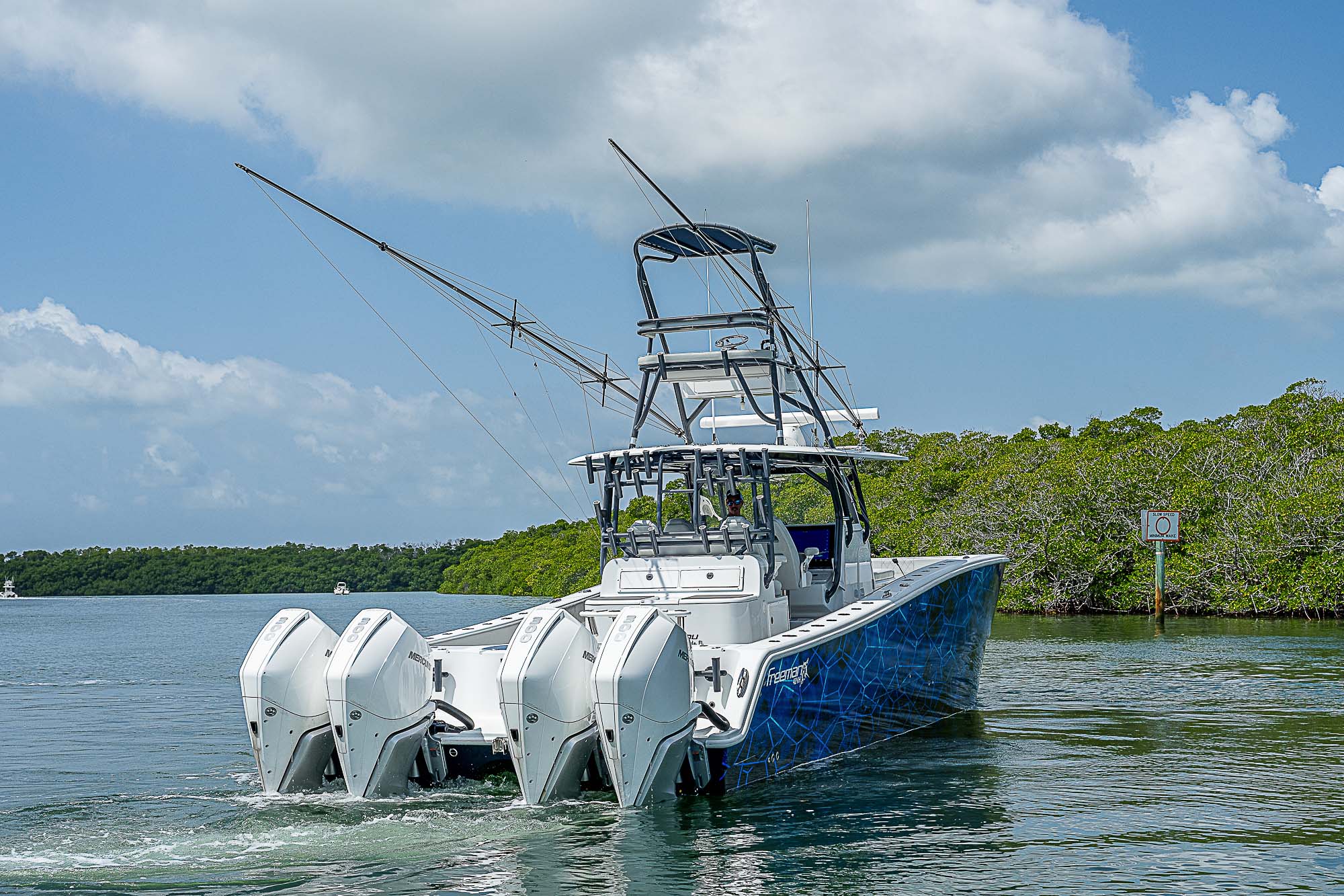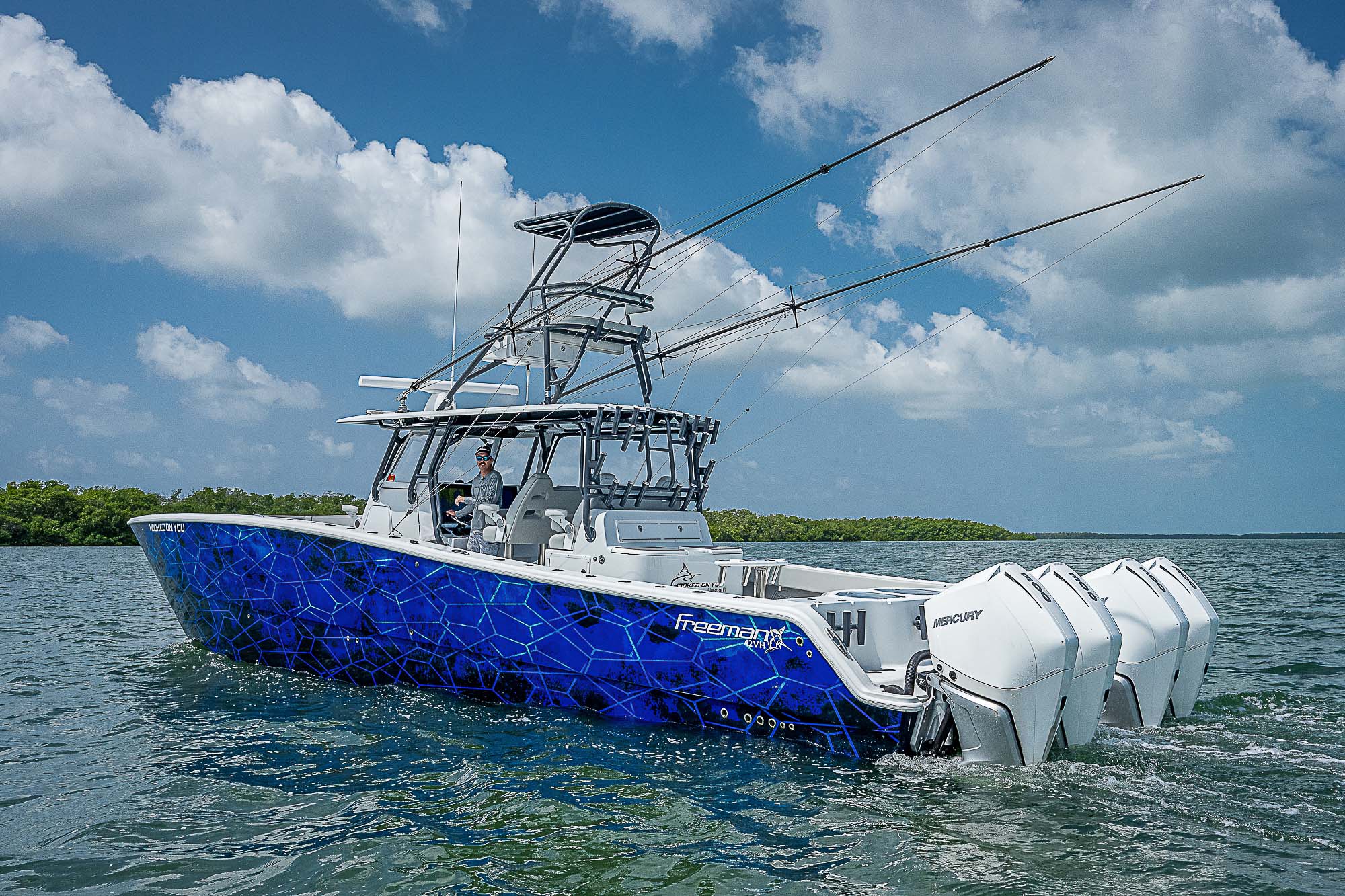 This 2021 42 Freeman is a fishing machine! It has double row seating, a rigging station, chiller plates, outriggers, foldable tower with controls, Garmin electronics, JL Audio Sound System, and more! This boat is perfect for fishing the USA or doing trips to the Bahamas! The engines currently have right at 1000 hours currently and have platinum warranty until December 2025.