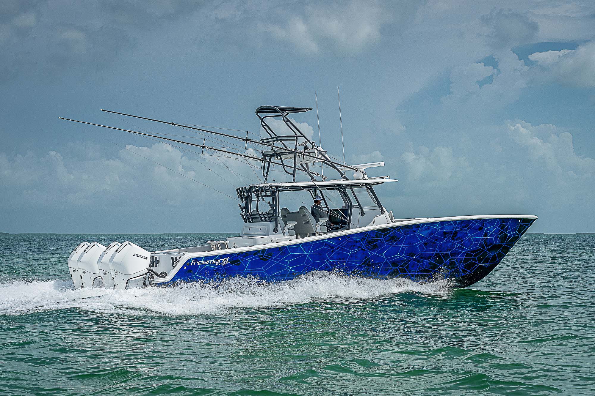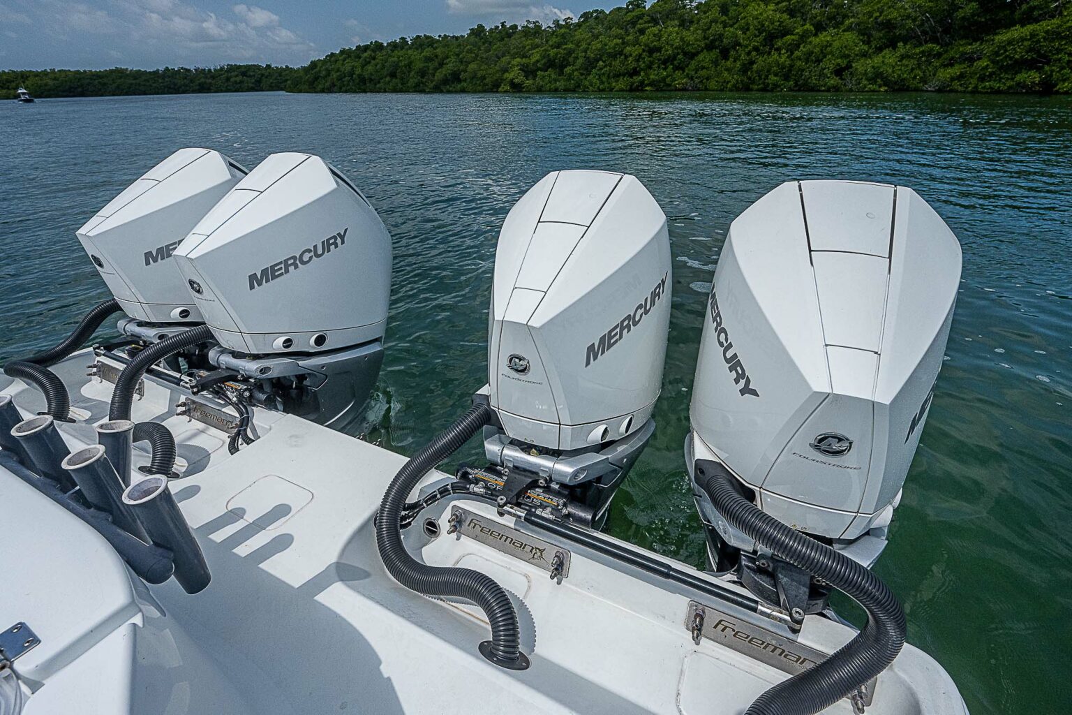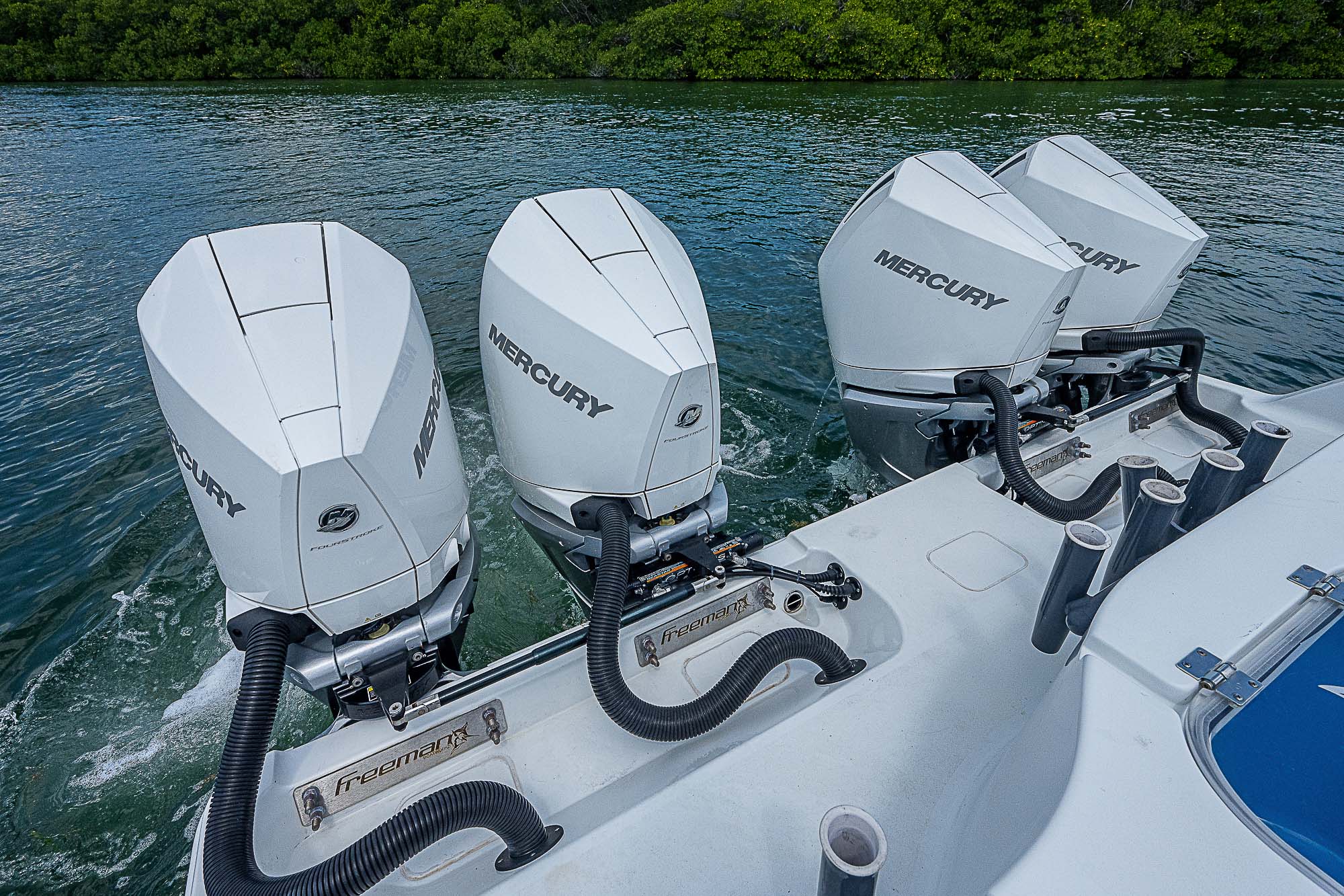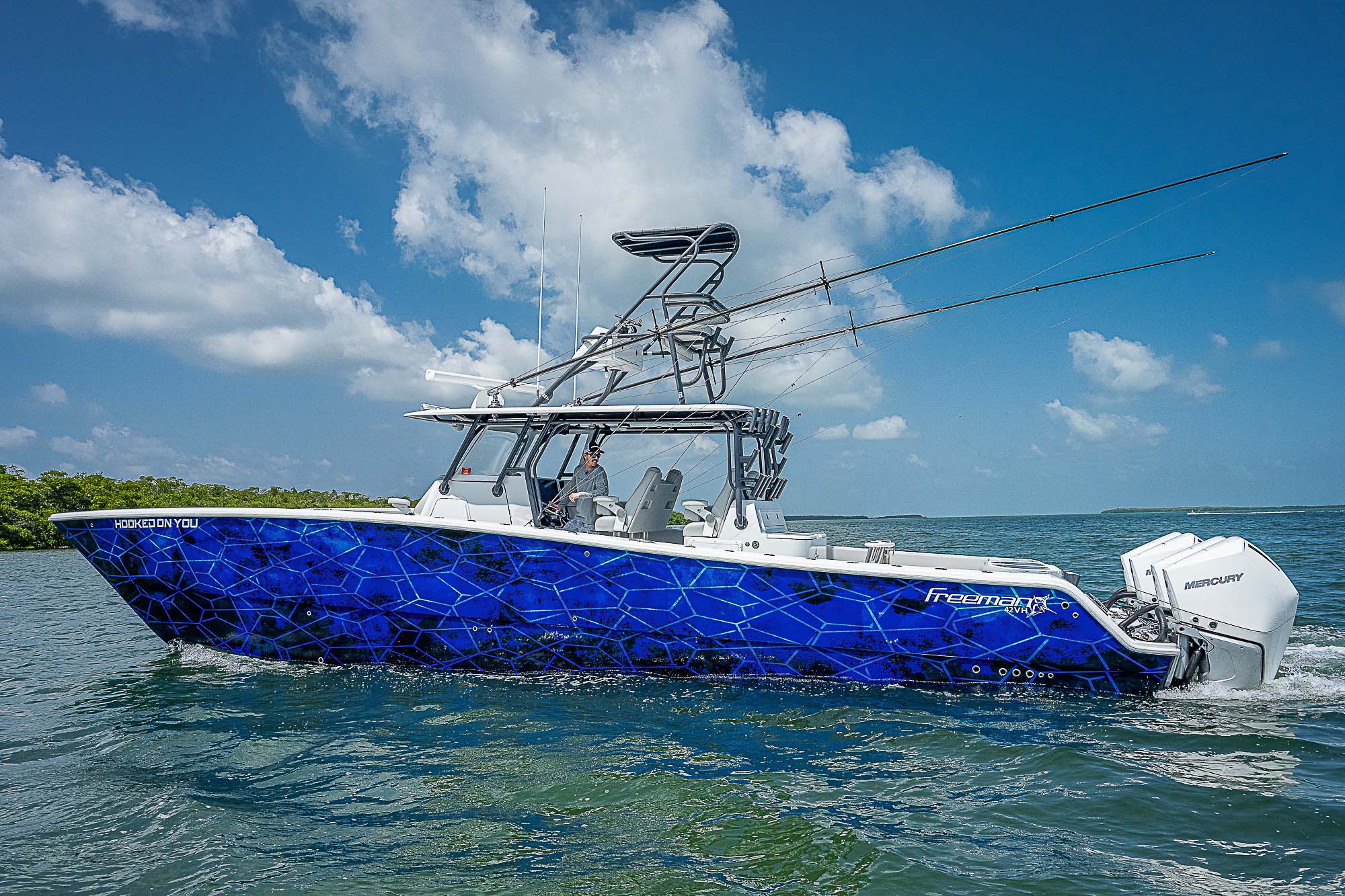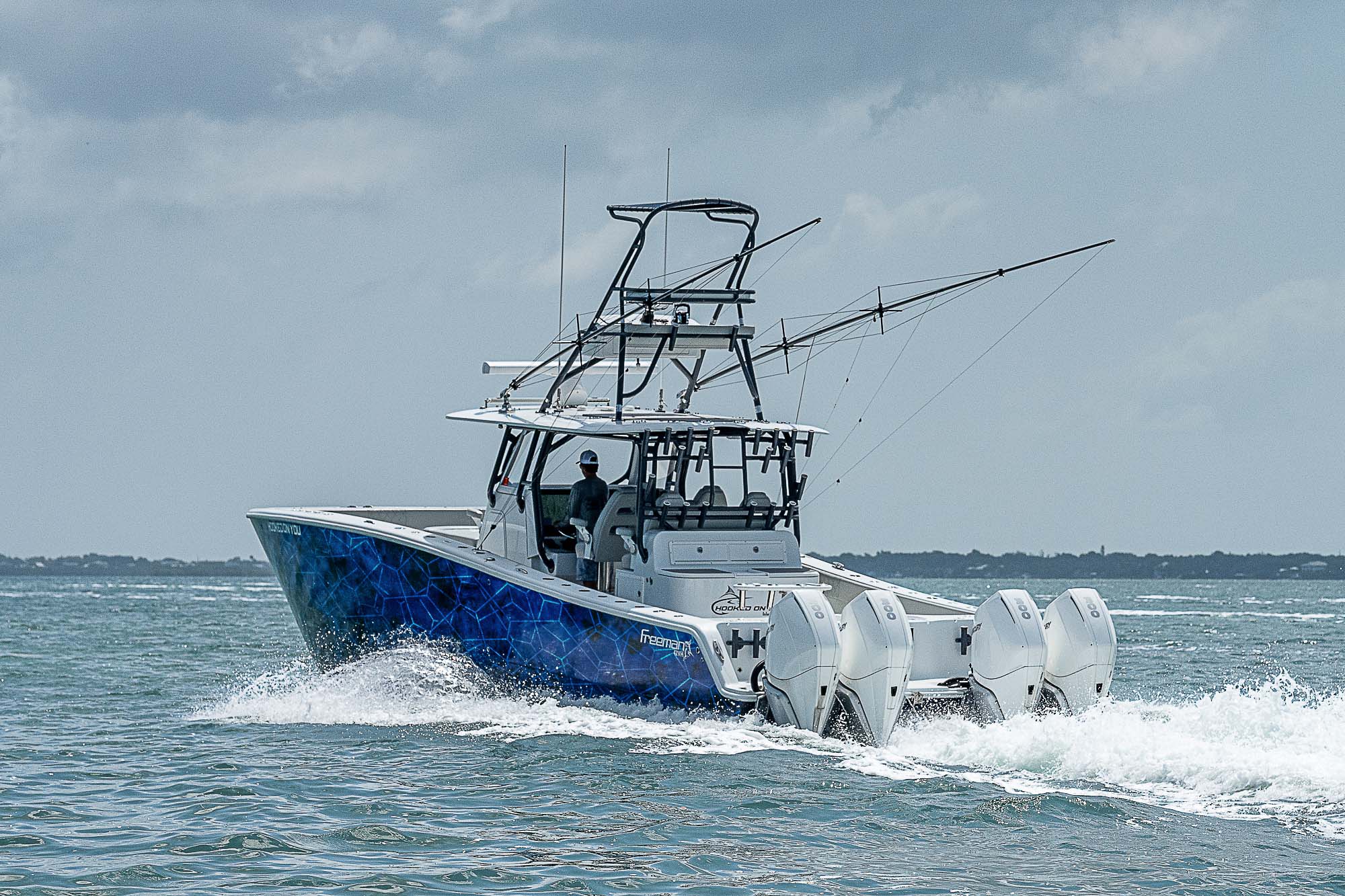 This 2021 42 Freeman is a fishing machine! It has double row seating, a rigging station, chiller plates, outriggers, foldable tower with controls, Garmin electronics, JL Audio Sound System, and more! This boat is perfect for fishing the USA or doing trips to the Bahamas! The engines currently have right at 1000 hours currently and have platinum warranty until December 2025.