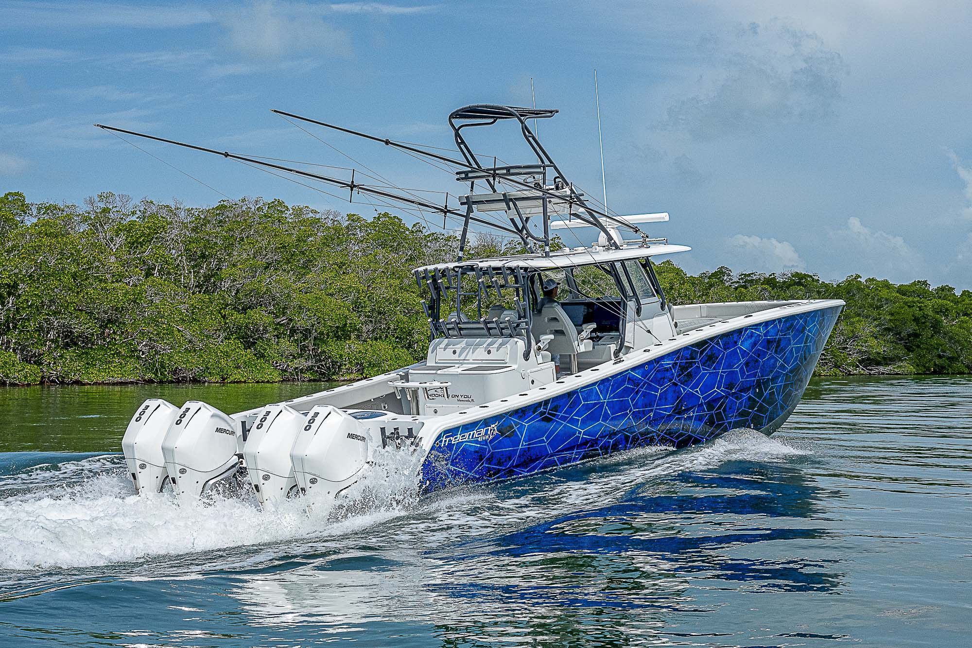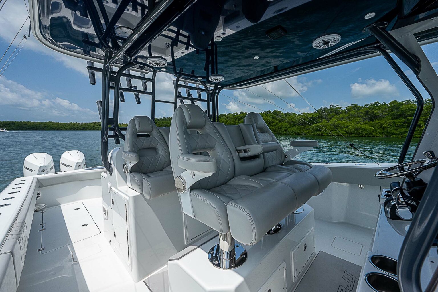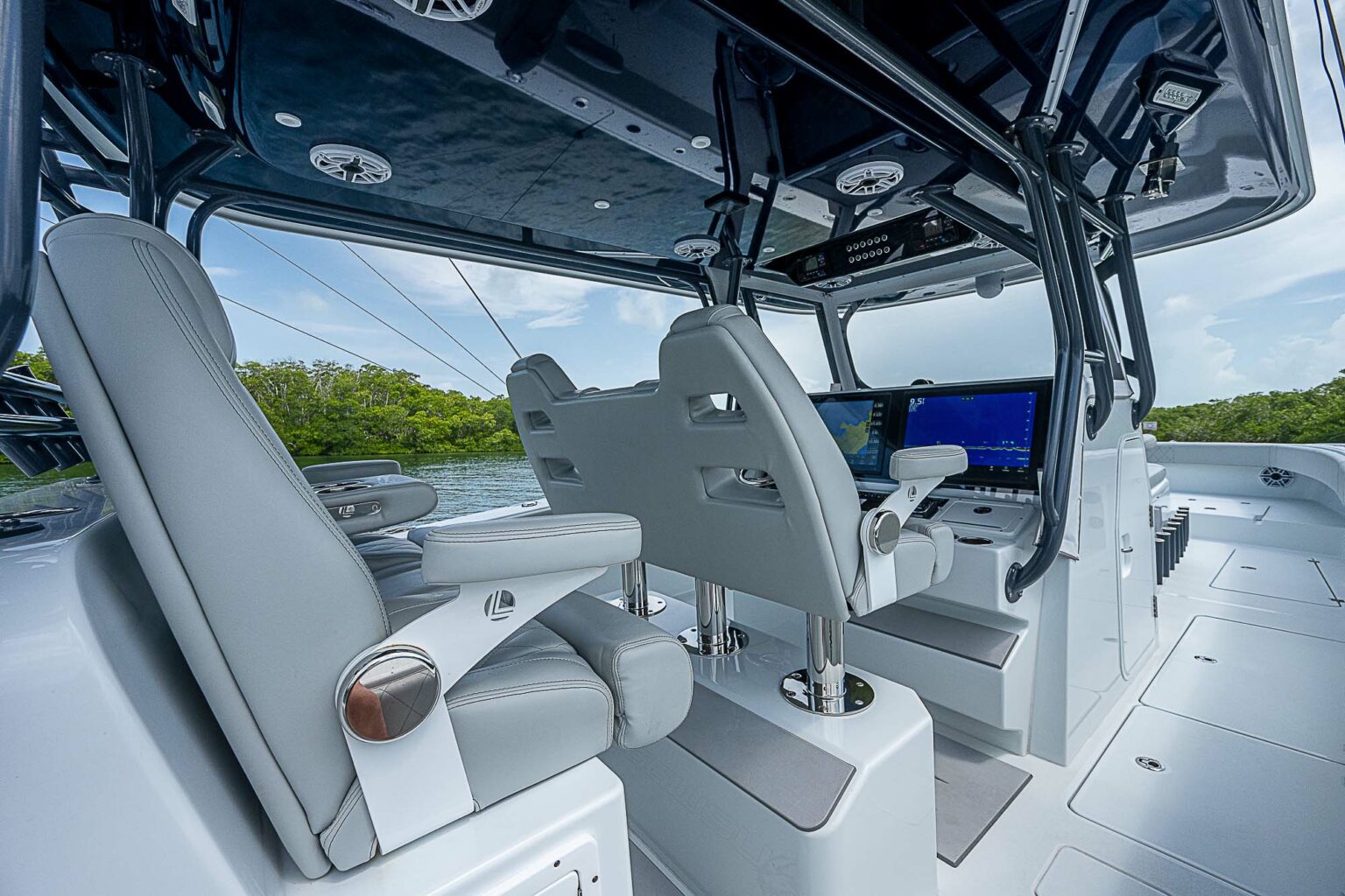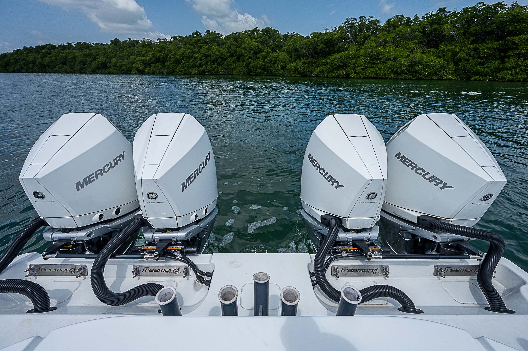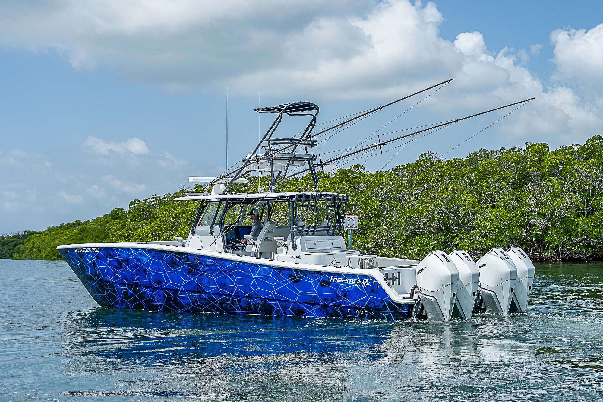 This 2021 42 Freeman is a fishing machine! It has double row seating, a rigging station, chiller plates, outriggers, foldable tower with controls, Garmin electronics, JL Audio Sound System, and more! This boat is perfect for fishing the USA or doing trips to the Bahamas! The engines currently have right at 1000 hours currently and have platinum warranty until December 2025.