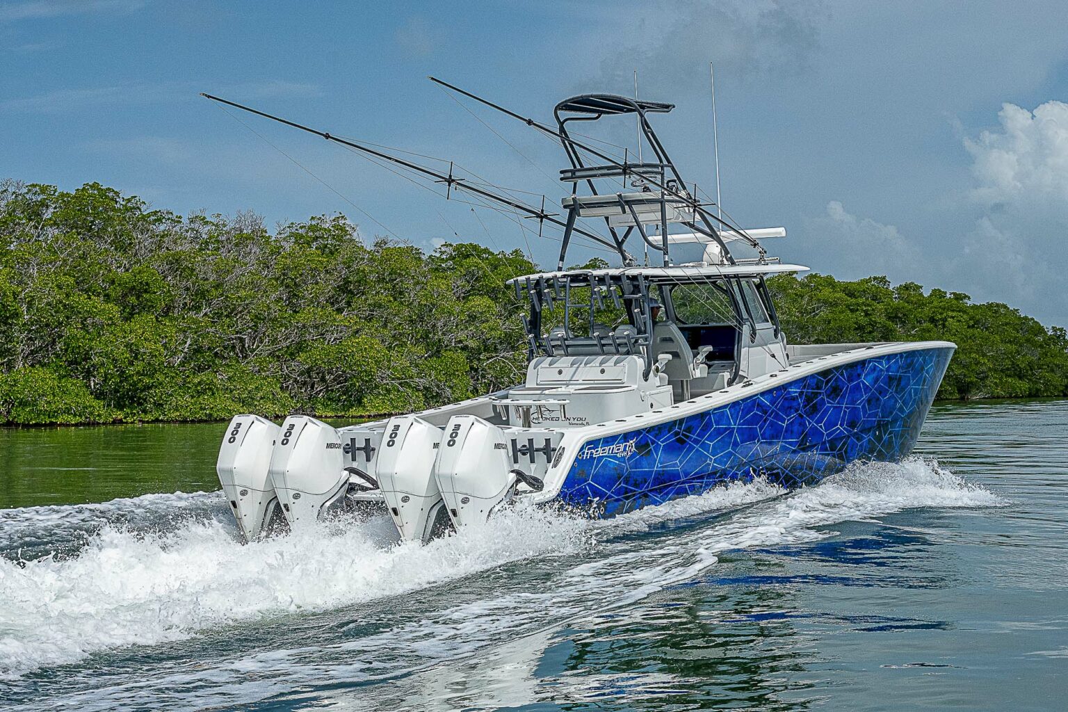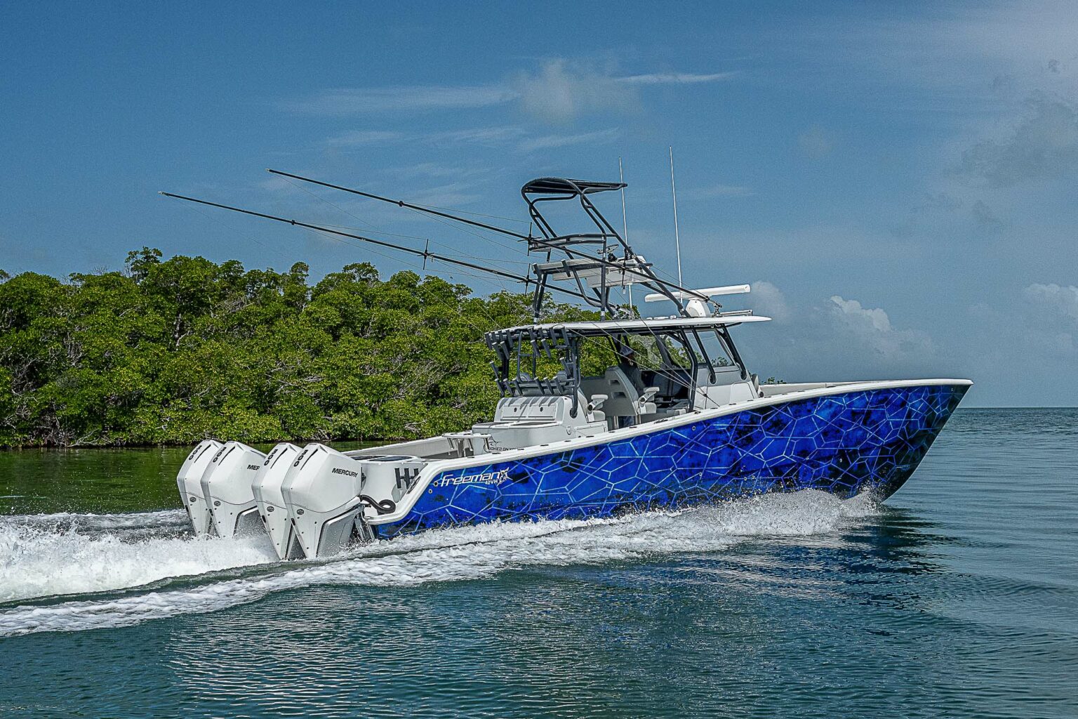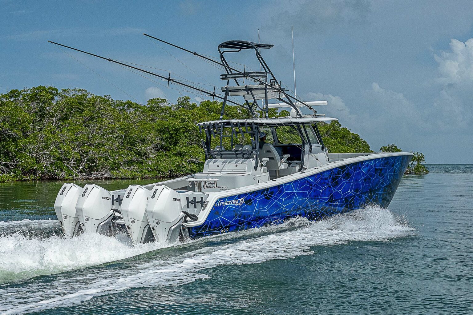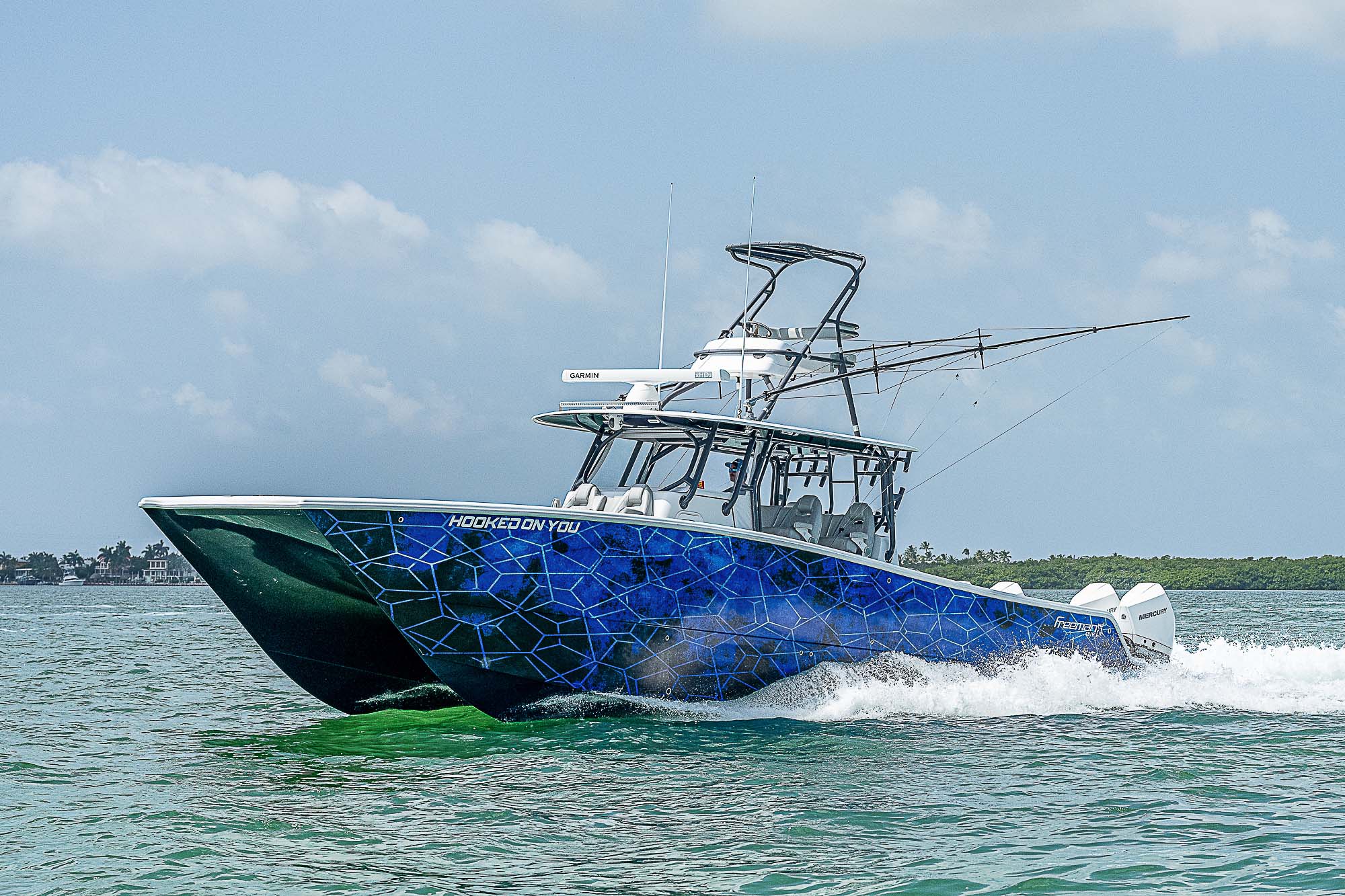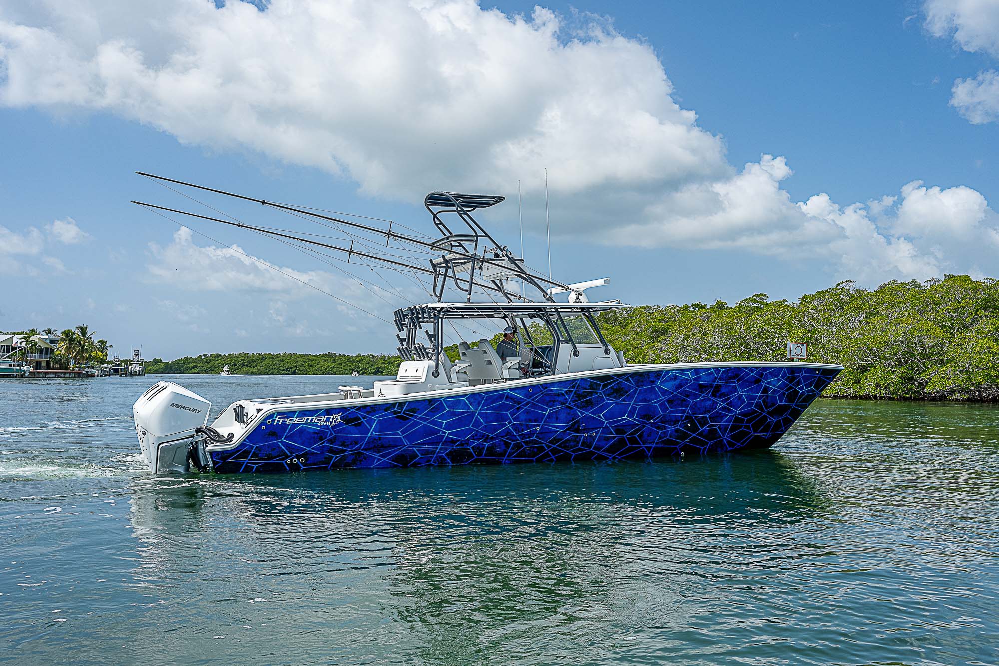 This 2021 42 Freeman is a fishing machine! It has double row seating, a rigging station, chiller plates, outriggers, foldable tower with controls, Garmin electronics, JL Audio Sound System, and more! This boat is perfect for fishing the USA or doing trips to the Bahamas! The engines currently have right at 1000 hours currently and have platinum warranty until December 2025.