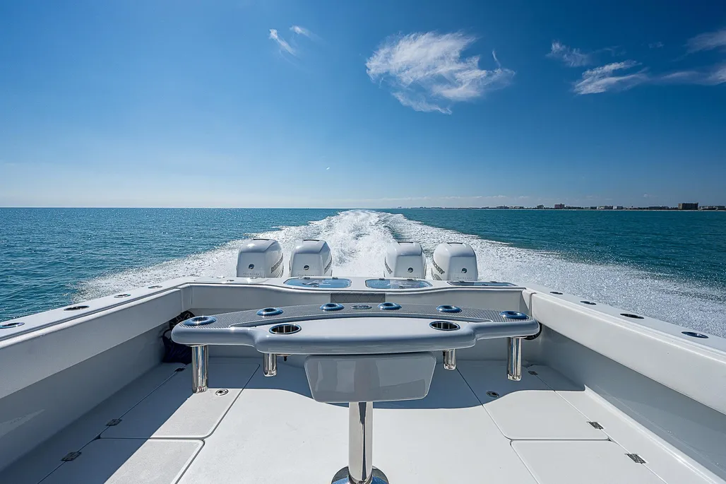 It’s powered by quad Mercury Verado 400’s. They were regularly serviced every 100 hours. It has an Optimus 360 JoyStick with a 10″ Mercury Screen. She has a custom marlin tower from from Custom Pipe Design with all LineX dark grey coated pipework. The tower also has a pair of electric teaser reels and Marsh Tacky Internal Outriggers. The Hull color is whisper gray as well as the tower control box.