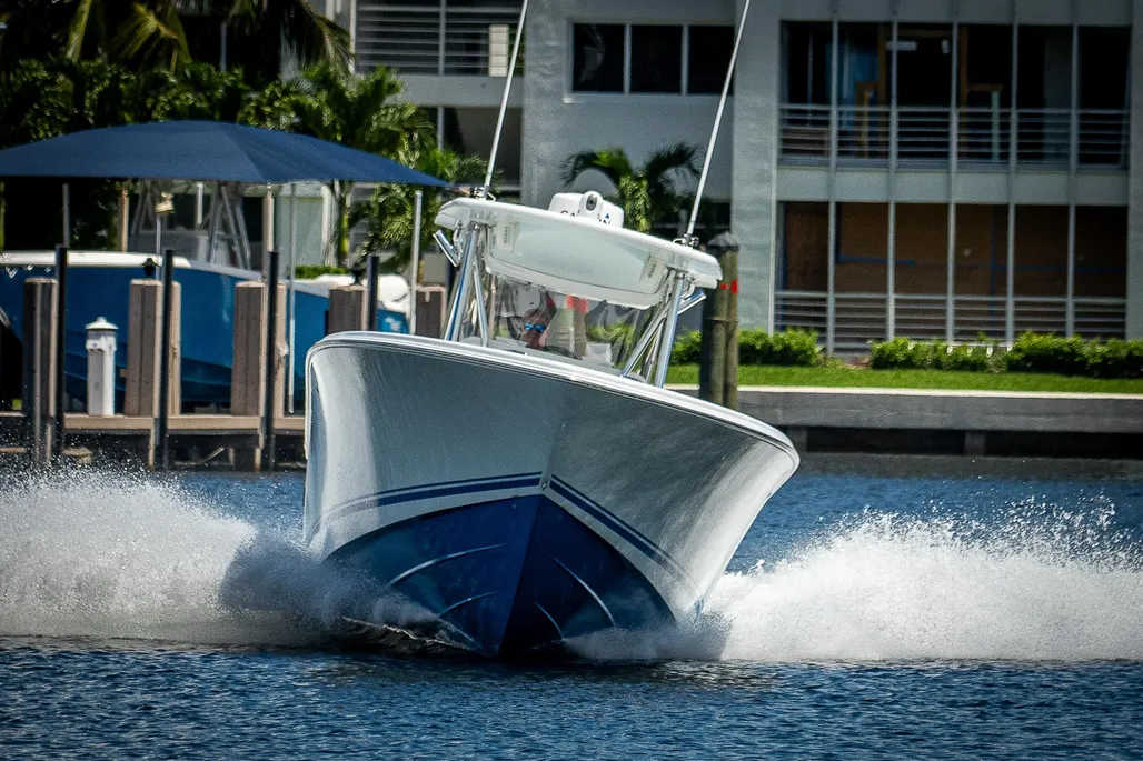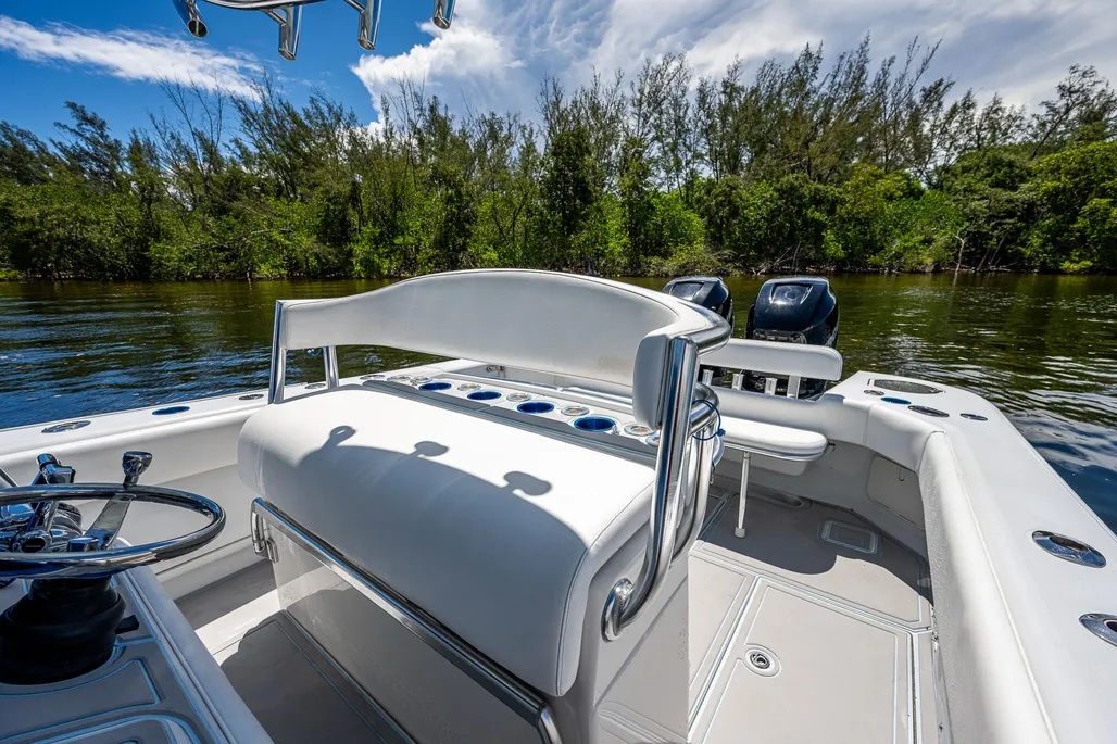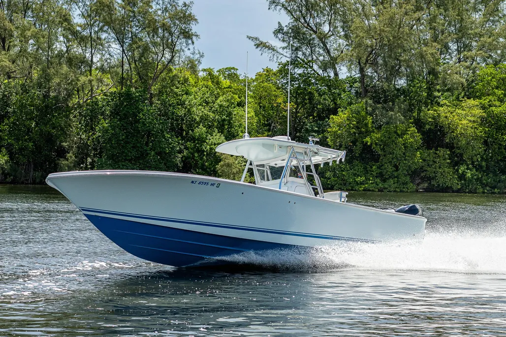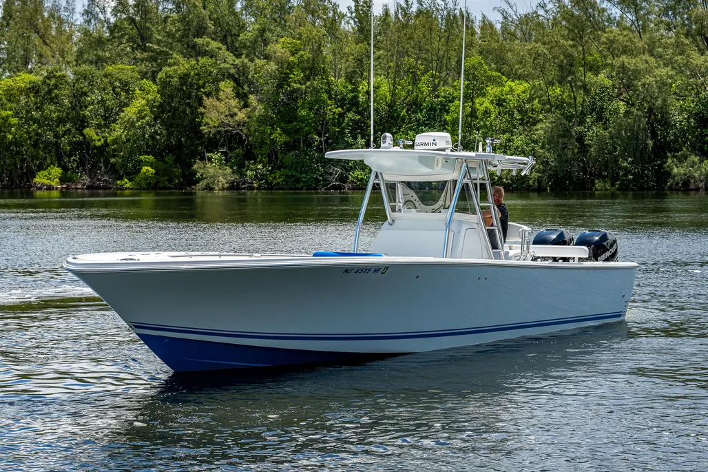 Dual Verado 400 power this highly advanced center console fisherman. The Revenge 35 is an overbuilt boat that doesn’t “do it all”. It is built to kill fish over rough waters and get you home safely. There aren’t a lot of frills. This boat is extremely well built and engineered. She has been very well maintained. A custom trailer is included. The trailer has a custom flushing system. The electronics are as follows: Twin icom IC-M506 – Airmar B275 transducer – FLIR- Garmin 8616 XSV touch screen displays (installed 8/24), Garmin XHD RADAR- Stereo: Rockford Fosgate stereo, amplifiers, speakers and subwoofers. The console has a head with storage & access to wiring. The rear bench is removable and foldable. The forward coffin box has rod storage on each side, a forward locker separate from the coffin fish box, and has a huge removable sunpad.